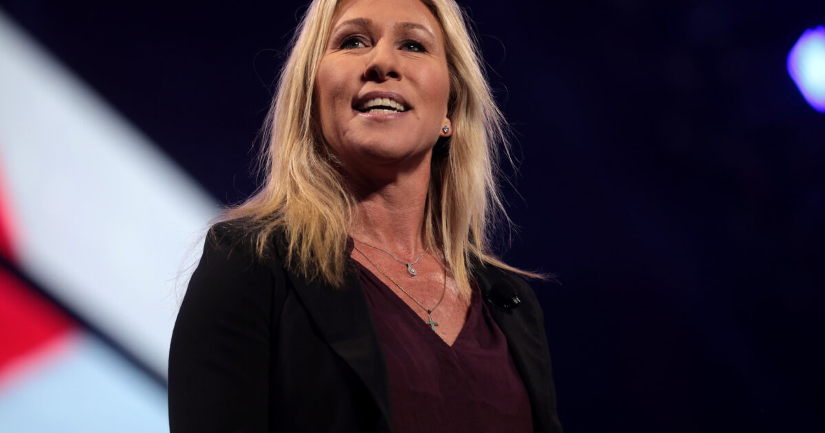 U.S. Congresswoman Marjorie Taylor Greene speaking with attendees at the 2021 AmericaFest at the Phoenix Convention Center in Phoenix, Arizona. (Credit: Gage Skidmore/Flickr)