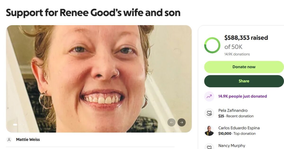 A GoFundMe campaign to raise money for the wife and son of Renee Nicole Good, the woman who was fatally shot while trying to mow down an ICE agent, has raised nearly $600,000 in less than a day.