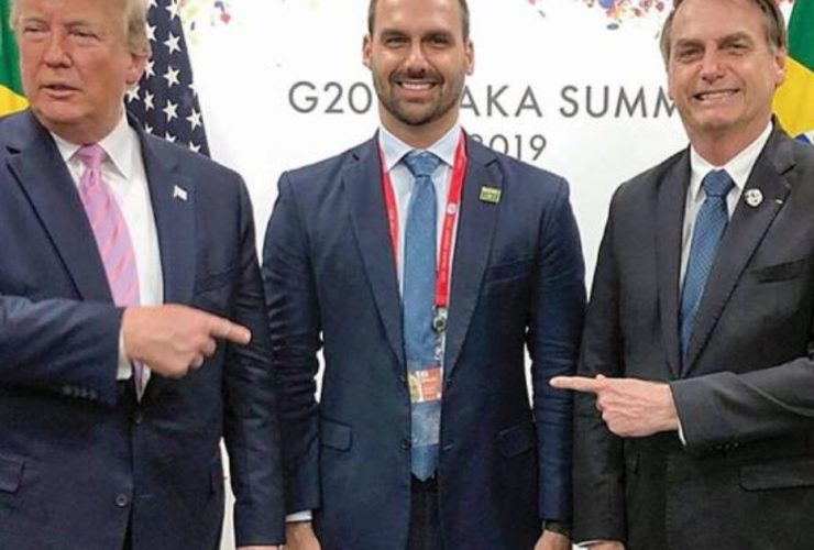 President Donald Trump, Congressman Eduardo Bolsonaro and Brazilian President Jair Bolsonaro meet at G20, in Japan. ...