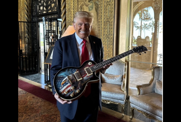 President Trump poses with his newly endorsed American Eagle electric guitar. On Friday, March 7, President ...