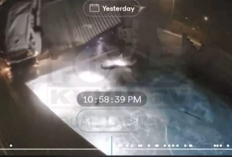 Home surveillance video shows the moment a speeding car crashed through a backyard wall, flipped over, ...