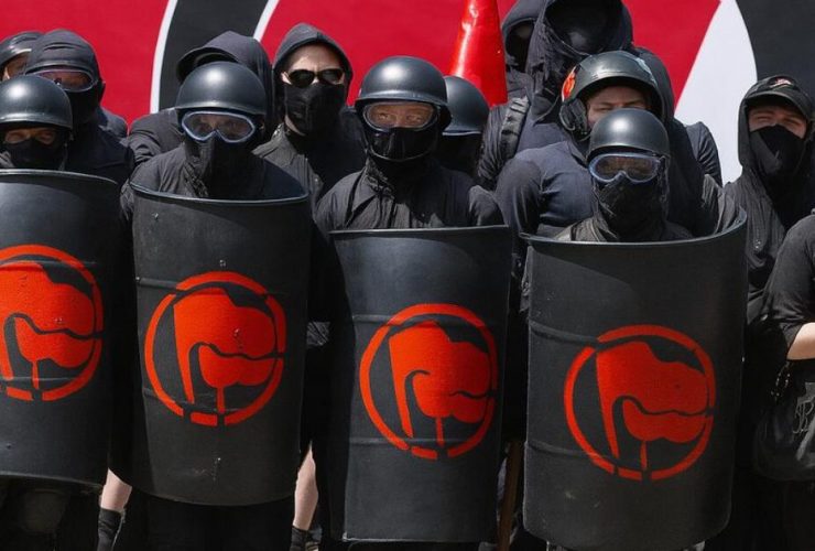 This is an AI-generated composite image based on real photographs of Antifa protests. A far-left thug ...
