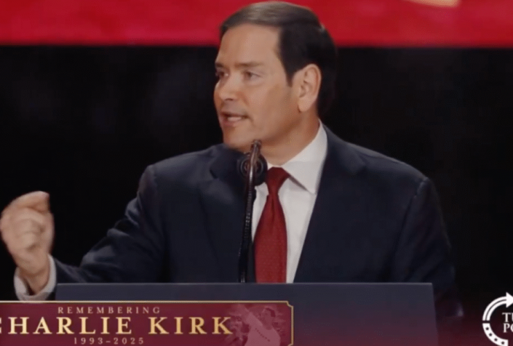 Secretary of State Marco Rubio speaks at memorial for Charlie Kirk./Image: Video screenshot courtesy of Turning ...