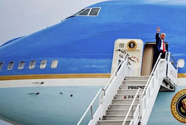 President Donald J. Trump waves as he boards Air Force One at Hartsfield-Jackson Atlanta International Airport ...